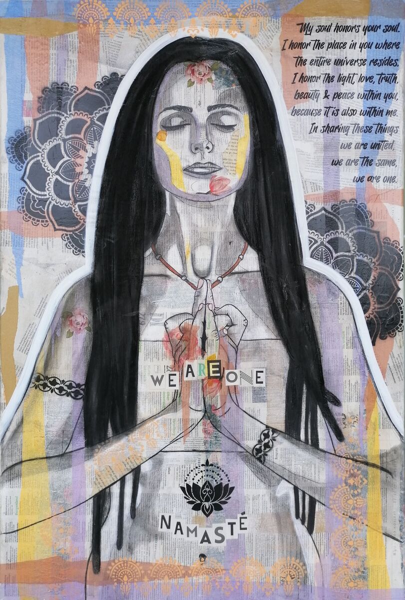 Mixed media on canvas. I used charcoal, newspaper, acrylic markers, acrylic spray, napkins and different other kinds of paper for this artwork.