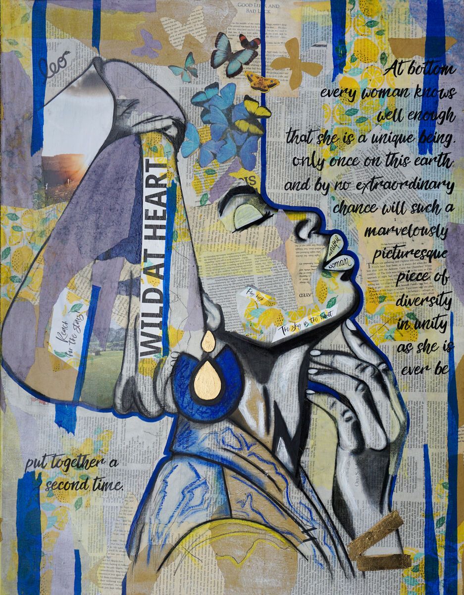 Mixed media on canvas. I used newspaper, magazines, other different kinds of paper, charcoal, pastels and gold leafs for this artwork.